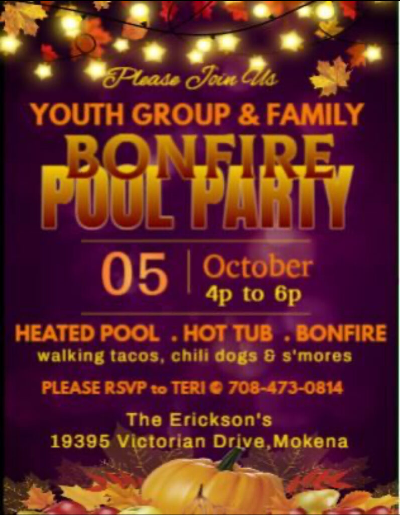 On October 5th, from 4-6pm, the Youth Group and their families are invited over to Teri Erickson’s house for a pool party and bon fire! Don’t worry, the pool is heated! Enjoy a heated pool, hot tub, bonfire, walking tacos, chili dogs, and s’mores. You can RSVP to Teri at 708-473-0814. See you there!