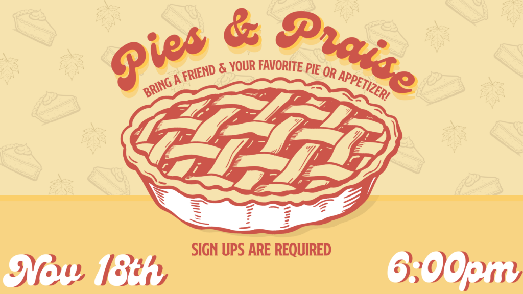 Come to our Women’s Pies and Praise for Potluck appetizers and pies, games and testimonies! It’s on Tuesday, November 18th at GFC from 6:00 pm to 8:30pm. This is an annual tradition where there will be A time of sharing, teaching and games! Bring a friend and sign up in the foyer or by clicking the button below!